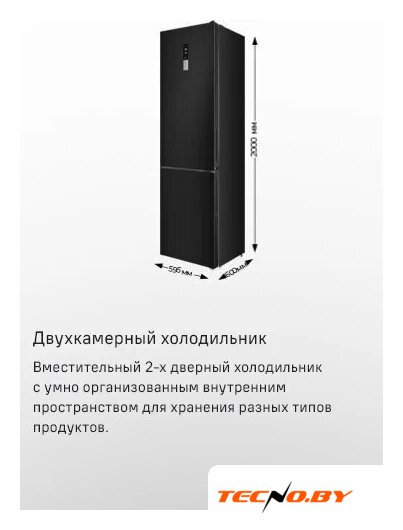 отдельностоящий, полный No Frost, электронное управление, класс A+, полезный объём: 317 л (223 + 94 л), перенавешиваемые двери, лоток для яиц, отделка: стекло, 59.5x63.5x185 см, черный