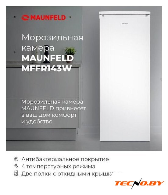 Классический белый цвет модели MAUNFELD MFFR143W делает ее универсальной и подходящей для любой кухни. Отдельностоящая конструкция не требует специального монтажа, а вес в 44 кг позволяет легко перемещать морозильник при необходимости. Это идеальное решение для тех, кто ищет надежность и простоту без лишних излишеств.