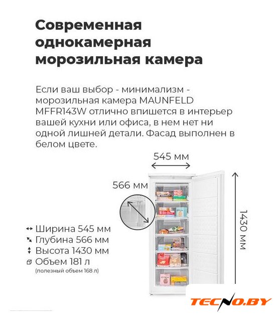 Морозильник MAUNFELD MFFR143W — это отличный выбор для тех, кто ценит свободное пространство и рациональное использование площади. С общим объемом камер в 181 литр, вы сможете хранить значительное количество замороженных продуктов. Полезный объем составляет 168 литров, что предоставляет достаточно места для вашей продукции. Несмотря на его вместимость, морозильник остается компактным благодаря своим аккуратным размерам: ширина 54.5 см, глубина 56.6 см и высота 143 см. Интегрированные ручки и возможность перенавешивания дверей делают его удобным в использовании и позволяют гармонично вписаться в интерьер вашего дома.