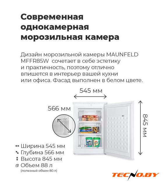 Морозильник MAUNFELD MFFR85W представляет собой отдельно стоящую конструкцию с лаконичным дизайном, выполненным в белом цвете. Его компактные размеры (ширина 54.5 см, глубина 56.6 см, высота 84.5 см) позволяют разместить устройство даже в ограниченном пространстве. Встроенные ручки и возможность перенавешивания дверей делают эксплуатацию морозильника еще более удобной и универсальной.