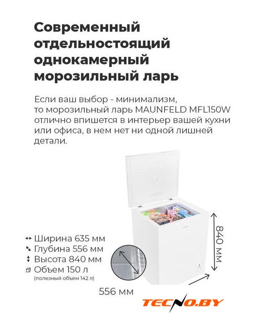 Морозильный ларь MAUNFELD MFL150W, выпущенный в 2021 году, сочетает в себе элегантный белый цвет и современный дизайн, который идеально дополнит любой интерьер. Это удобное и функциональное решение для ваших кухонных нужд. Морозильный ларь является отдельностоящим устройством, что позволяет свободно размещать его в любом удобном месте. Несмотря на компактные габариты (ширина 63.5 см, глубина 55.6 см, высота 84 см), он предлагает внушительный объем для хранения продуктов.