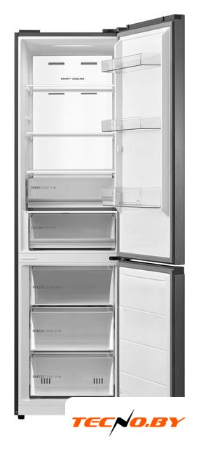 отдельностоящий, без No Frost, электронное управление, класс A+, полезный объём: 364 л (205 + 159 л), зона свежести, перенавешиваемые двери, полка для вина, лоток для яиц, 59.5x62.9x206.8 см, серебристый