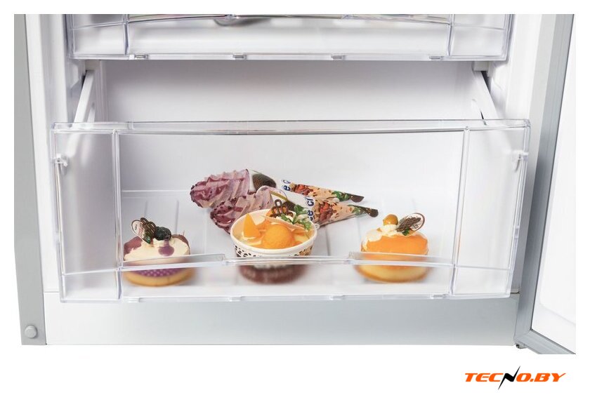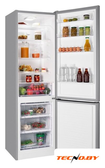 Холодильная камера Nordfrost прекрасно справляется с хранением разнообразных продуктов. Четыре пластиковых дверных балкона дают возможность удобно размещать пакеты с напитками и соусы. В комплекте также есть ящик для хранения овощей и фруктов. Отсутствие зоны свежести компенсируется высоким качеством исполнения стандартных полок и ящика для овощей.