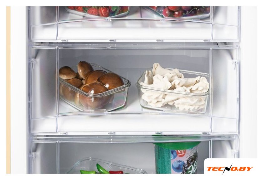 Оснащенная пятью стеклянными полками и пластиковыми дверными балконами, холодильная камера обеспечивает удобную организацию пространства. Встроенный ящик для овощей и фруктов поможет сохранить свежесть ваших продуктов, а лоток для яиц станет практичным дополнением. Благодаря этим деталям ваши продукты всегда будут под рукой и в отличном состоянии.