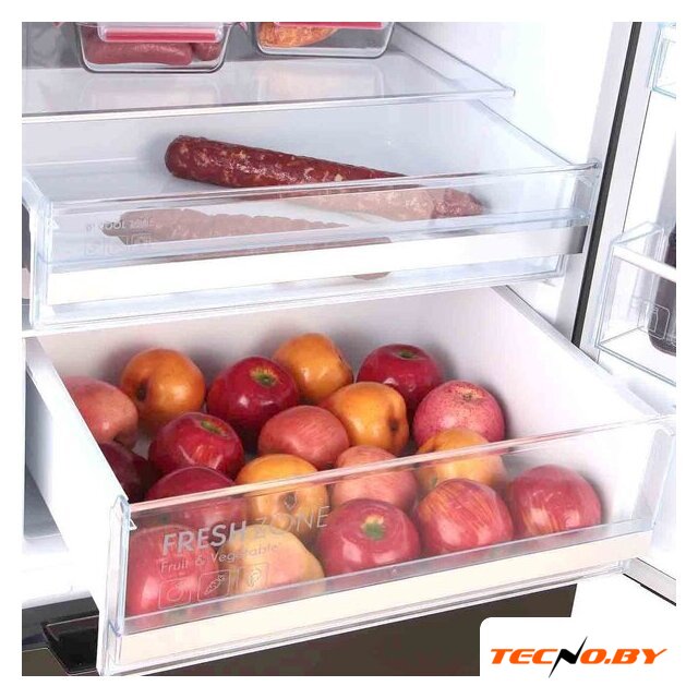 Шесть дверных балконов, два ящика для овощей и фруктов, полка для вина — все материалы тщательно подобраны: стекло и пластик, придающие вашему холодильнику современный вид и функциональность. В морозильной камере предусмотрена мощность замораживания до 4.5 кг/сутки, однако отсутствует генератор льда и освещение, что компенсируется общей надежностью и вместимостью модели.