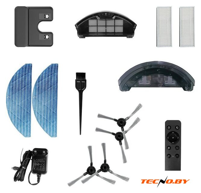 | Комплектация | ПылесосЩетка для чистки фильтра Тряпка для влажной уборки - 2 штЗарядная док-станция Контейнер для водыПульт ДУАккумуляторная батареяОсновная щеткаБоковая щетка - 4 штФильтр HEPA - 2 шт |