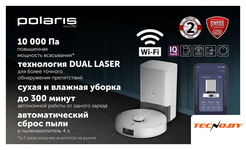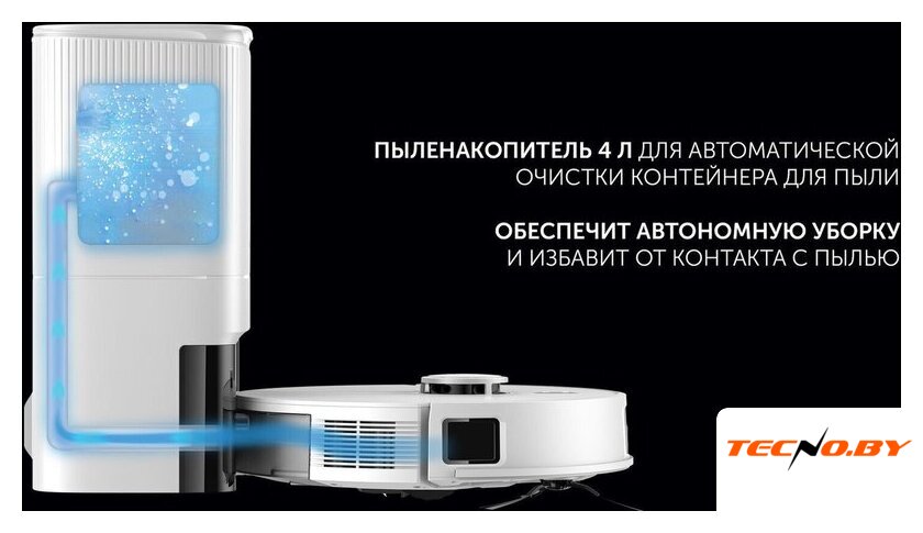 влажная уборка, сила всасывания 4000 Па, пылесборник 0.57 л, навигация: контактный бампер, лидар, датчики перепада высоты, база самоочистки