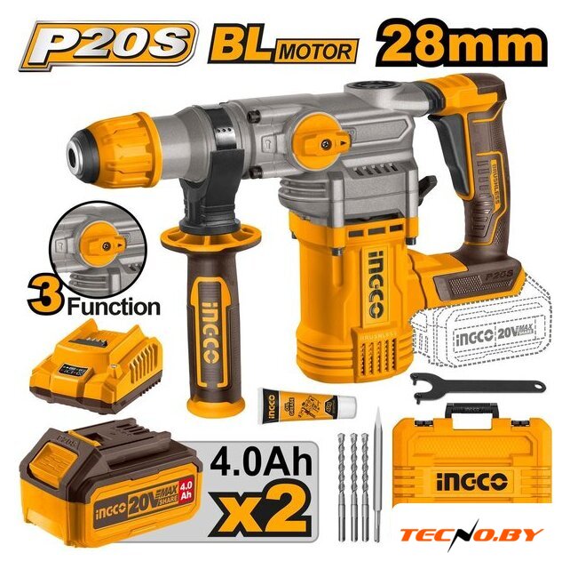 Комплект поставки | - перфоратор, - 2хАКБ 4Ач, - зарядное устройство на 2.0А, - эргономичная рукоятка, - буры 8/10/12 SDS-plus - 3 шт., - пика SDS-plus - 1 шт., - паспорт, - гарантийный талон. |