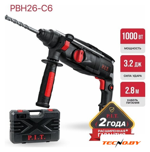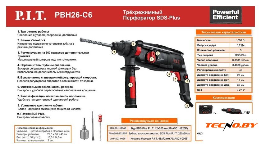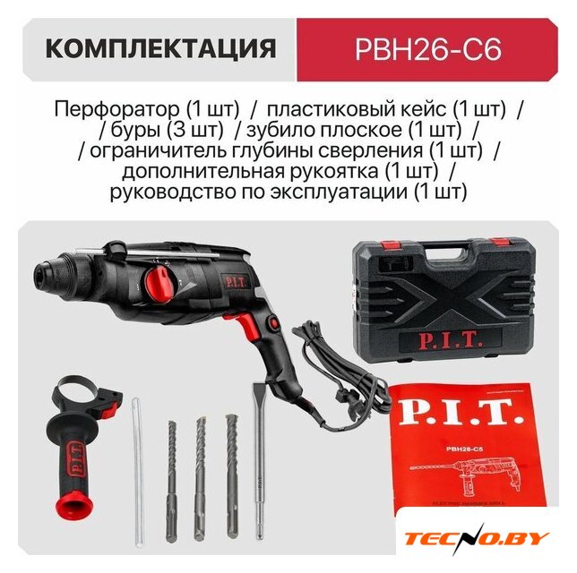| Комплект поставки | - Перфоратор, - пластиковый кейс, - буры (3 шт.), - зубило плоское, - ограничитель глубины сверления, - дополнительная рукоятка, - инструкция по эксплуатации |