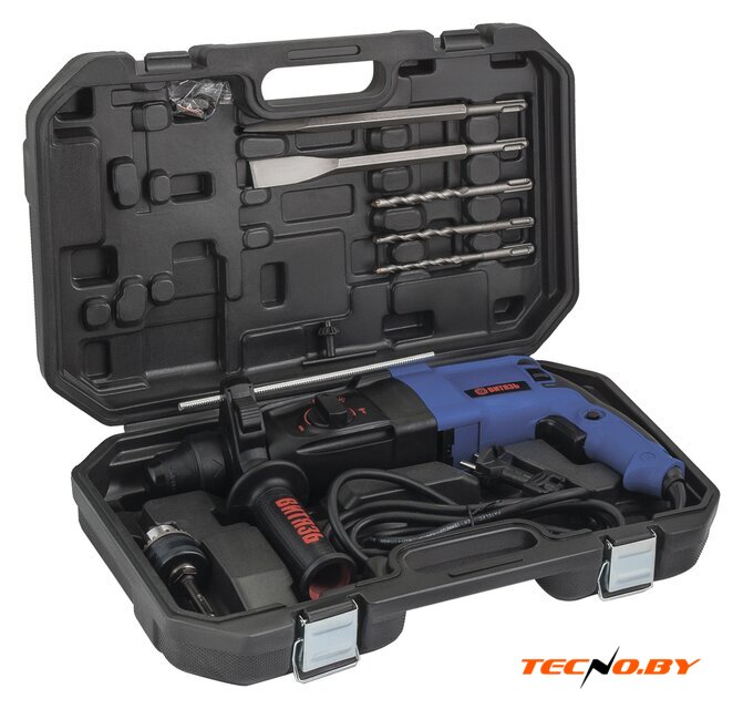 Комплект поставки | - кейс, - 3 SDS+ бура 8/10/12/ 150 мм, - пика, - зубило, - регулируемая боковая рукоятка ,- дополнительный патрон, - адаптер. |