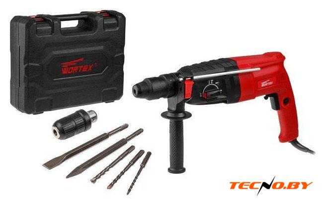 Комплект поставки | - Дополнительная рукоятка- Быстрозажимной патрон- 3 сверла: 8х150, 10х150, 12х150 мм- 2 зубила: пиковое 230 мм и плоское 20х230 мм- Ограничитель глубины сверления- Кейс |