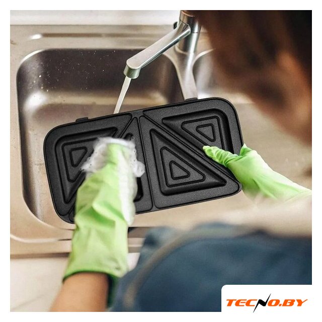 сэндвичница, 900 Вт, поверхность: форма для 2 ломтиков хлеба, съемные плитки, нержавеющая сталь/черный