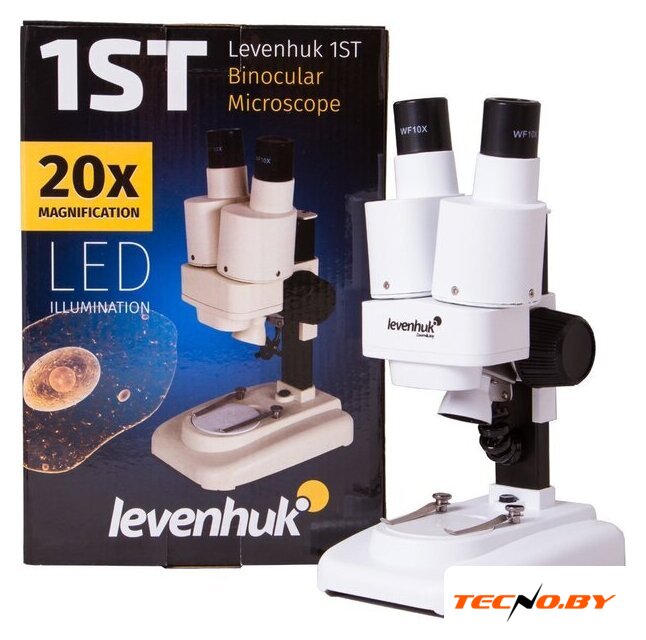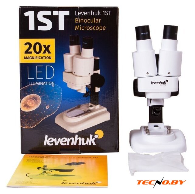 | Состав набора | микроскоп Levenhuk 1ST, бинокулярная насадка, окуляры WF10x (2 шт.), объектив 2x, чехол, белая пластина (предметный столик), инструкция по эксплуатации и гарантийный талон |