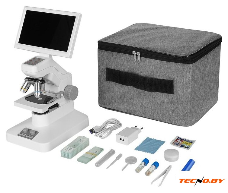 | Состав набора | основание со встроенным источником проходящего света, штатив с механизмом фокусировки, предметный столик со стеклом и зажимами, оптическая головка со встроенной камерой, осветителем отраженного света, револьверное устройство с объективами 4х, 10х и 40х, монитор LCD, набор для экспериментов, адаптер 5В 2А, кабель USB – Type-C, аккумулятор 18650, кейс, руководство по эксплуатации и гарантийный талон |