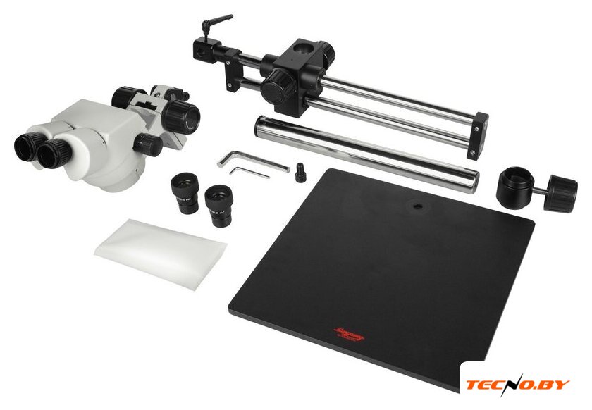 | Состав набора | бинокулярная оптическая головка с блоком объективов, окулярные тубусы и механизмом зуммирования; кронштейн оптической головки с поворотным адаптером; горизонтальная направляющая в сборе; штативная штанга с ограничительной муфтой; основание микроскопа; окуляры WF 10х/20 мм; наглазники резиновые на окуляры; болт крепления штативной штанги; рукоятка крепления кронштейна; винт крепления оптической головки; рукоятки подвижной каретки направляющей; ключ шестигранный 10 мм; ключ шестигранный 4 мм; руководство по эксплуатации; гарантийный талон |
