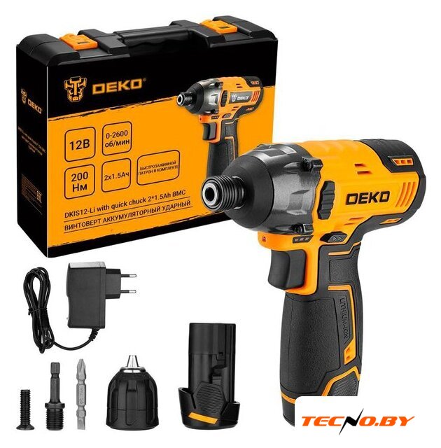 Комплектация | - Винтоверт;- Литиевый аккумулятор 1,5 Ач - 2 шт.- Зарядное устройство;- Дополнительный быстрозажимной патрон;- Переходник на быстрозажимной патрон;- Двухсторонняя бита;- Руководство по эксплуатации;- Кейс. |