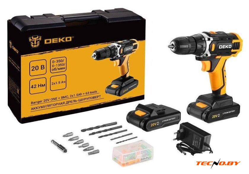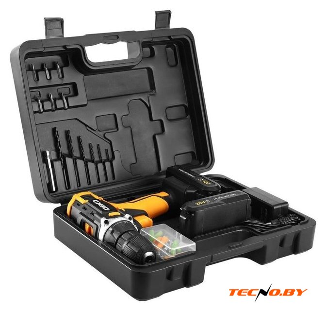 Комплектация | - Дрель-шуруповерт - 1 шт.- Аккумулятор 1,5 Ач - 2 шт.- Зарядное устройство - 1 шт.- Биты - 6 шт.- Сверла - 6 шт.- Держатель бит - 1 шт.- Набор крепежа - 50 шт.- Руководство по эксплуатации - 1 шт.- Кейс - 1 шт. |