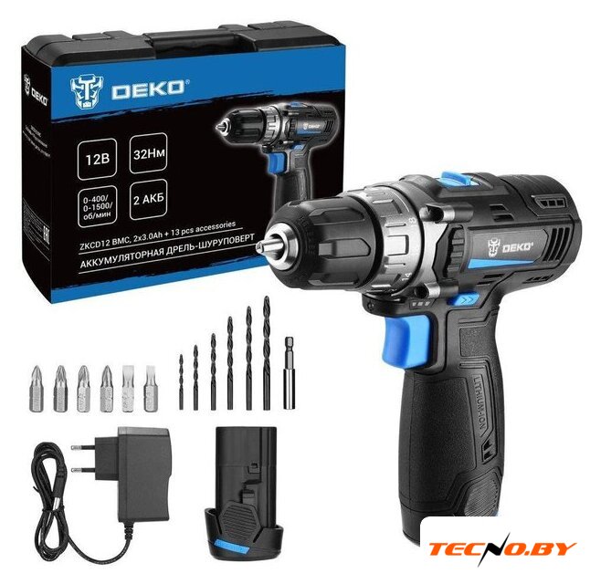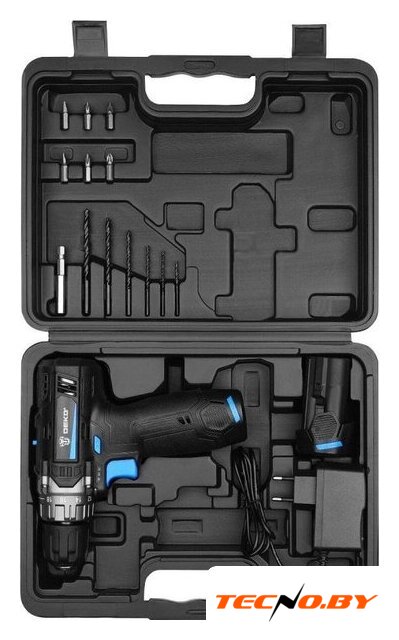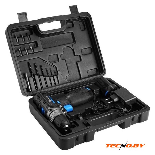 | Комплектация | - Дрель-шуруповерт - 1 шт.- Аккумулятор 3,0 Ач - 2 шт.- Зарядное устройство - 1 шт.- Сверла: 2, 2.5, 3, 4, 5, 6 мм - 6 шт.- Биты: SL4, SL6, PH1, PH2, PZ1, PZ2 - 6 шт.- Удлинитель для бит - 1 шт.- Инструкция- Кейс |