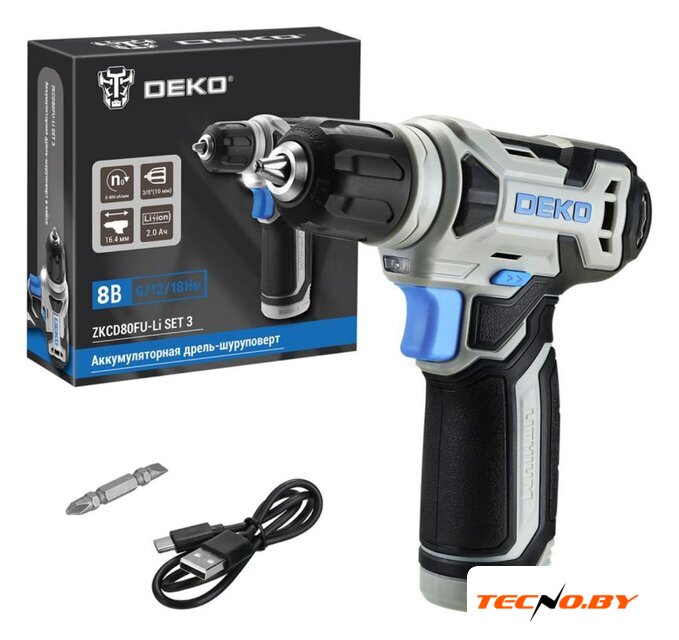 Комплектация | - 1 шт аккумуляторная дрель-шуруповерт DEKO ZKCD80FU-Li;- 1 шт бита;- 1 шт кабель для зарядки Type-C. |