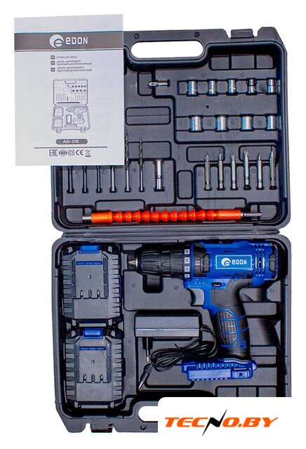 Комплектация | - Дрель-шуруповерт- 2 аккумулятора- Зарядное устройство- Набор насадок- Инструкция- Кейс |