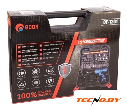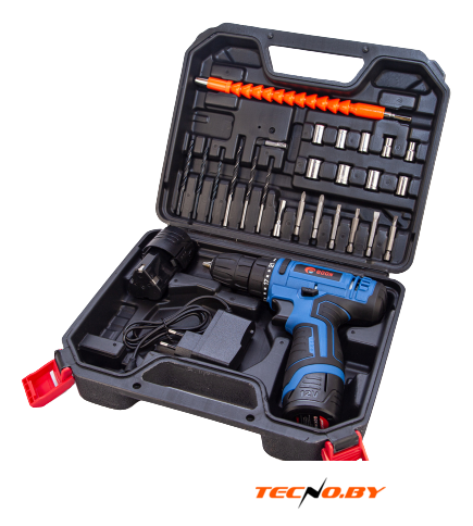 Комплектация | Комплект поставки: шуруповерт, 2 аккумулятора, зарядное устройство, набор насадок, пластиковый кейс.В набор насадок входит:- Различные биты – 6 шт.;- Головки – 5, 6, 7, 8, 9, 10, 11, 12, 13 мм.;- Переходник – 2 шт.;- Сверла по дереву – 4, 5, 6 мм.;- Сверла по металлу - 4, 5, 6 мм.;- Гибкий удлинитель 25 см. – 1 шт. |