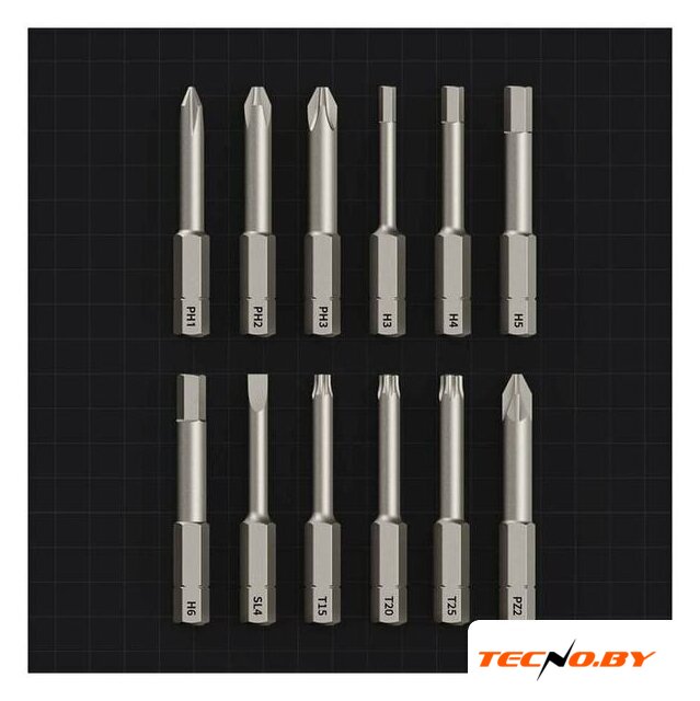 | Биты (насадки-отвертки) | 12 (Hex, Torx, Phillips, Pozidriv) (PH1/PH2/PH3/H3/H4/H5/H6/T15/T20/T25/PZ2) |
