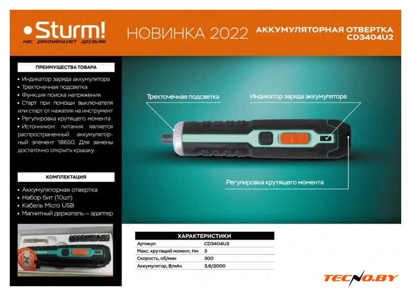 Комплектация | - Аккумуляторная отвертка;- Набор бит (10шт);- Кабель micro USB;- Магнитный держатель - адаптер для бит. |