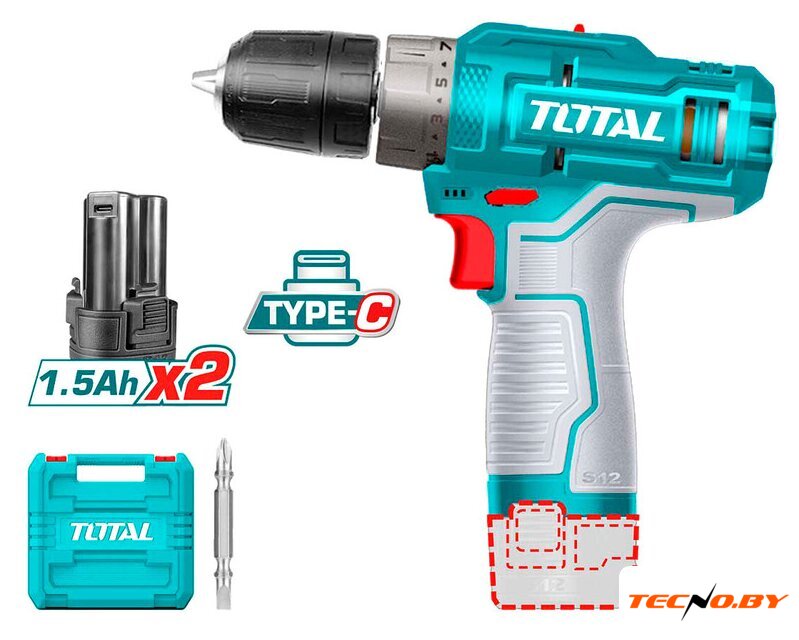 Комплектация | Аккумуляторная дрель-шуруповерт - 1 шт.Аккумуляторная батарея TBLI12153 Li-Ion 1,5 Ач - 2 шт.Двухстороння бита 65 мм - 1 шт.ИнструкцияКейс |