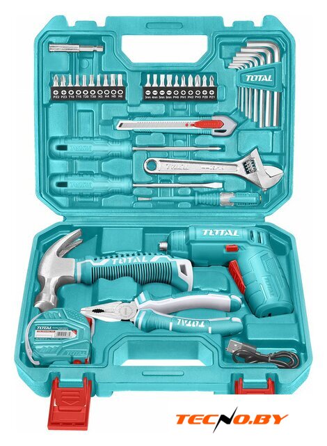 Комплектация | - Отвертка аккумуляторная - 1 шт.- Отвертка SL5.5x100 - 1 шт.- Отвертка PH1x100 - 1 шт.- Комбинированные плоскогубцы 6" - 1 шт.- Разводной ключ 6" - 1 шт.- Мини-молоток - 1 шт.- Индикаторная отвертка (напряжение: 100-500 В переменного тока) - 1 шт.- Рулетка 3 м - 1 шт.- Нож с сегментным лезвием 9 мм - 1 шт.- Бита (SL3, SL4, SL5, SL6, PH0, PH1, PH2, PH3, PZ0, PZ1, PZ2, PZ3, T10, T15, T20, T30, H3, H4, H5, H6) - 20 шт.- Магнитный держатель для бит - 1 шт.- Шестигранный ключ (1,5/2/2,5/3/4/5/5,5/6 мм) - 8 шт.- Кейс |