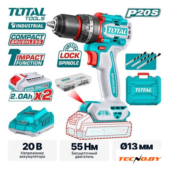 Комплектация | - Бесщеточная дрель-шуруповерт - 1 шт.- Аккумулятор 2,0 Ач TFBLI20011 - 2 шт.- Зарядное устройство 2,0 А TFCLI2001 - 1 шт.- Сверло по металлу - 3 шт.- Набор акксессуаров - 47 шт.- Инструкция- Кейс |