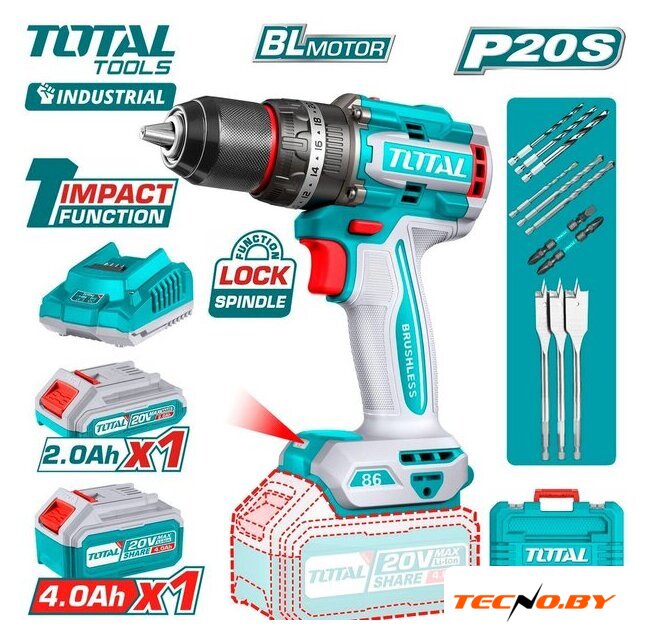 | Комплектация | - Ударная дрель-шуруповерт - 1 шт.- Аккумулятор 2,0 Ач TFBLI20011 - 1 шт.- Аккумулятор 4,0 Ач TFBLI20021 - 1 шт.- Зарядное устройство TFCLI20411 - 1 шт.- Двухсторонняя бита PH2+PH2 - 1 шт.- Двухсторонняя бита PH2+SL6 - 1 шт.- Сверло по дереву (16, 19, 22 мм) - 3 шт.- Сверло HSS по металлу (4, 5, 6 мм) - 3 шт.- Сверло по камню (5, 6, 8 мм) - 3 шт.- Инструкция- Кейс |
