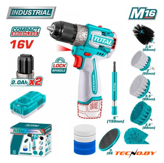 Комплектация | - Аккумулярторная дрель-шуруповерт - 1 шт.- Аккумулятораная батарея TFBLI1620 2,0 Ач - 2 шт.- Зарядное устройство TFCLI1613 1,3 А - 1 шт.- Удлинитель 150 мм - 1 шт.- Щетки - 11 шт.- Инструкция;- Коробка. |