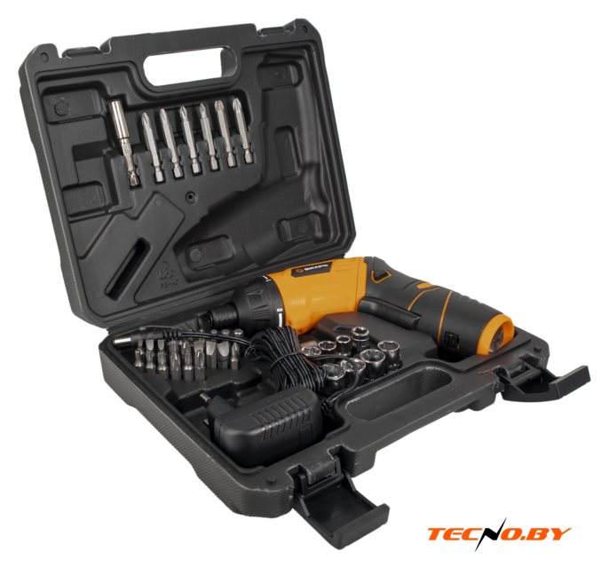 Комплектация | - Отвертка со встроенным аккумулятором - Набор бит - Набор торцевых головок - Адаптер-удлинитель для бит - Сетевой адаптер - Кейс |