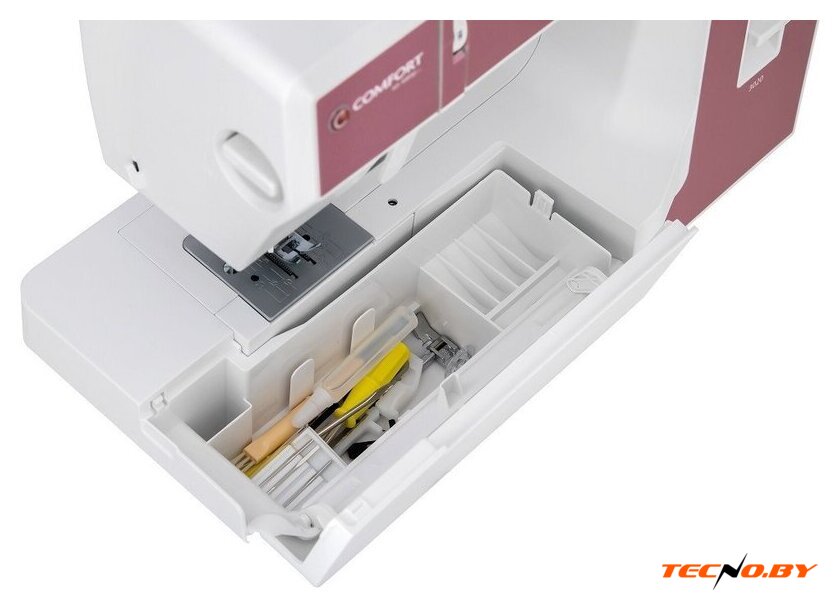 электромеханическая, вертикальный качающийся челнок, полуавтоматическое выполнение петли, швейные операции: имитация оверлочной строчки/потайная строчка/трикотажная строчка/декоративная строчка