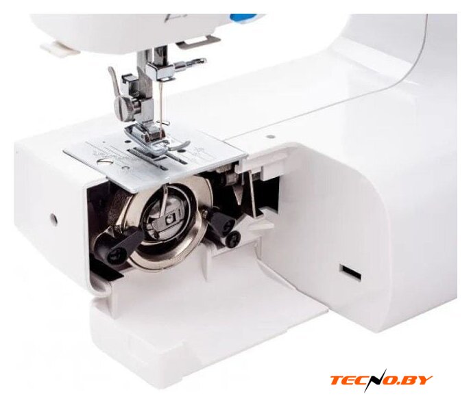 электромеханическая, вертикальный качающийся челнок, полуавтоматическое выполнение петли, швейные операции: имитация оверлочной строчки/потайная строчка/декоративная строчка