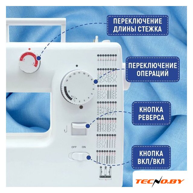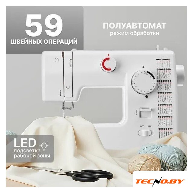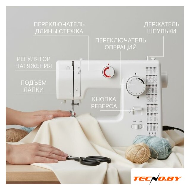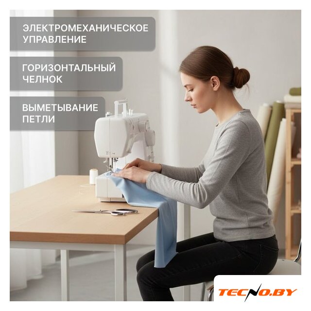 электромеханическая, вертикальный качающийся челнок, полуавтоматическое выполнение петли, швейные операции: потайная строчка/трикотажная строчка/декоративная строчка