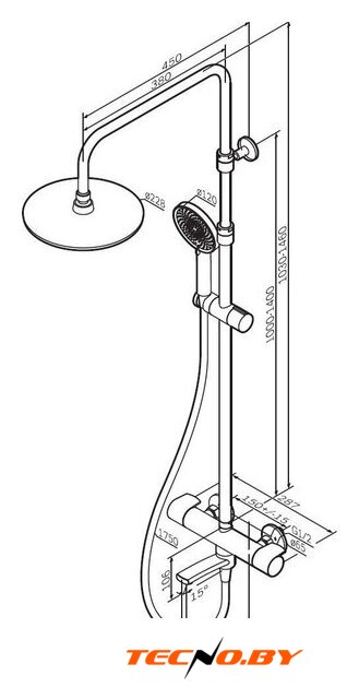 | Комплектация | верхний душ, штанга, ручной душ (лейка), держатель лейки, шланг, смеситель, излив для ванны |