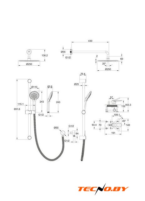| Комплектация | верхний душ, штанга, ручной душ (лейка), держатель лейки, шланг, смеситель |