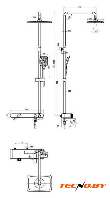 | Комплектация | верхний душ, штанга, ручной душ (лейка), держатель лейки, шланг, смеситель, излив для ванны, полочка |