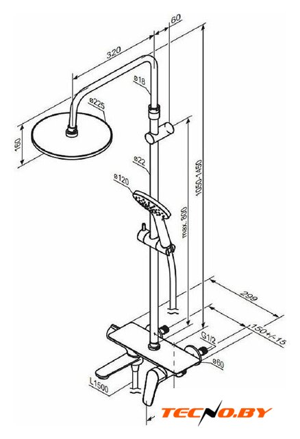 душевая система (с верхним душем), настенный монтаж, механический смеситель, верхний душ 25 мм 120 мм