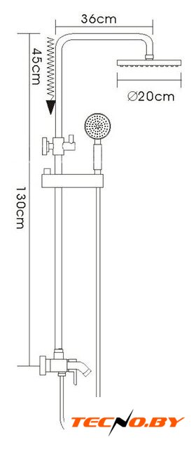 | Комплектация | верхний душ, штанга, ручной душ (лейка), держатель лейки, шланг, смеситель, излив для ванны |