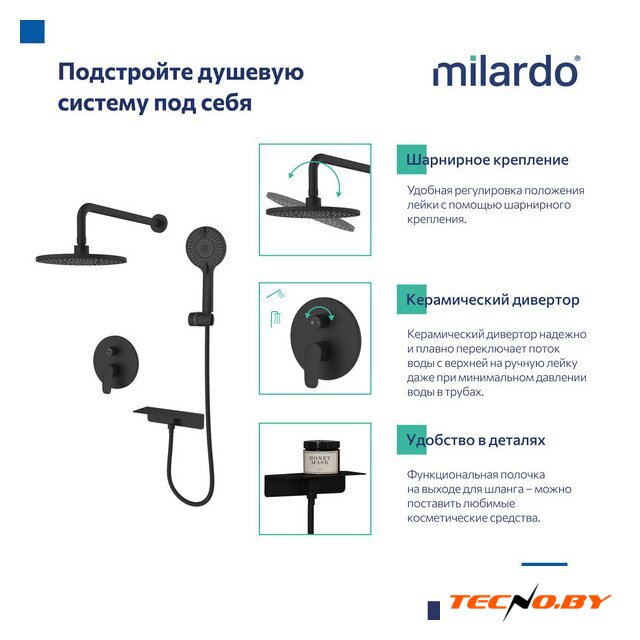 | Комплектация | верхний душ, ручной душ (лейка), держатель лейки, шланг, смеситель |
