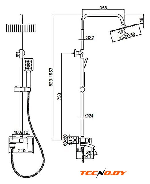 | Диаметр (ширина) верхнего душа | 250 мм |