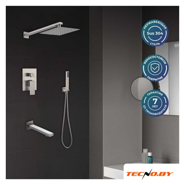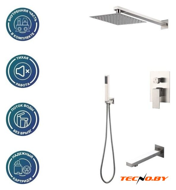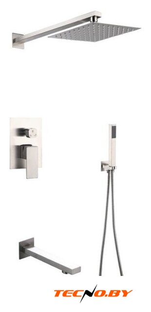 | Комплектация | верхний душ, ручной душ (лейка), держатель лейки, шланг, смеситель, излив для ванны |