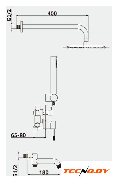 | Комплектация | верхний душ, ручной душ (лейка), держатель лейки, шланг, смеситель, излив для ванны |