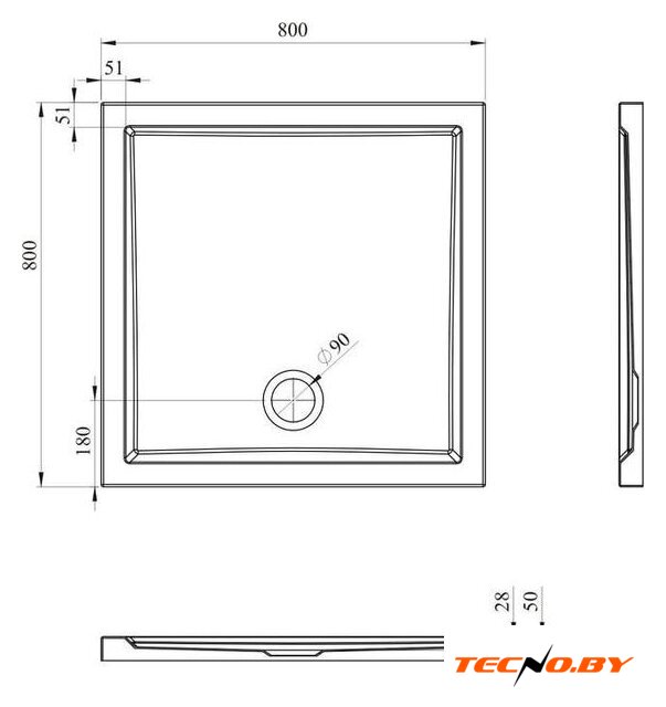 квадратный, 80x80 см, акрил, низкий, 15 см, противоскользящее покрытие дна, цвет: белый