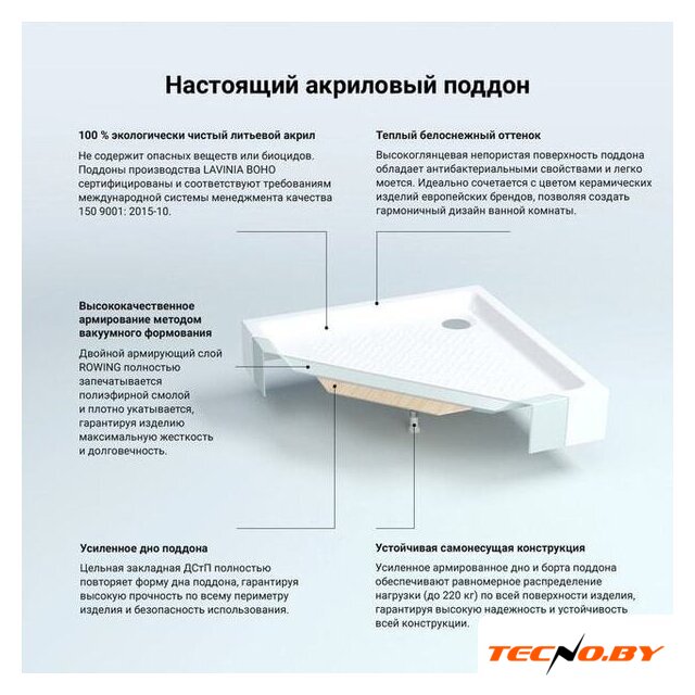 квадратный, 100x100 см, акрил, низкий, 15 см, противоскользящее покрытие дна, цвет: белый