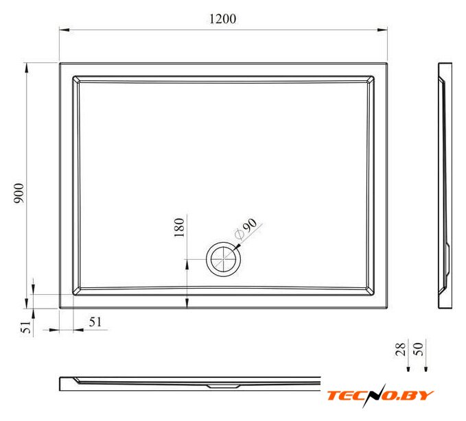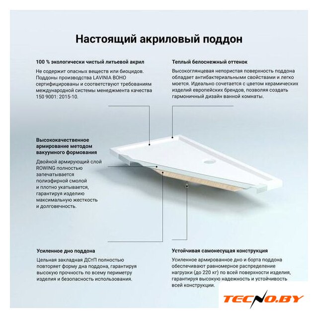 прямоугольный, 100x90 см, искусственный камень, низкий, 2.5 см, противоскользящее покрытие дна, цвет: белый