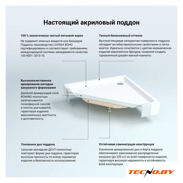квадратный, 90x90 см, акрил, низкий, 17 см, противоскользящее покрытие дна, цвет: белый