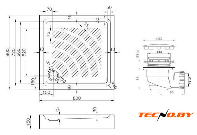 закруглённый, 90x90 см, акрил, высокий, 15 см, противоскользящее покрытие дна, цвет: белый